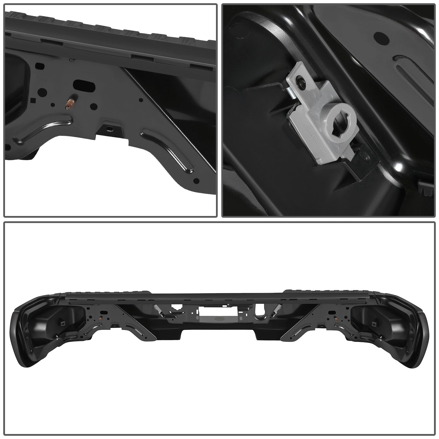 DEFENSA TRASERA 19-23 CHEVY SILVERADO 1500 GMC SIERRA 1500 ALSO FITS CHEVY SILVERADO 1500 LTD 22 AND GMC SIERRA 1500 LIMITED 22 - CORNER STEP MODEL W/O PARKING SENSOR HOLES - W/ EXHAUST CUTOUTS - BLACK/STEEL