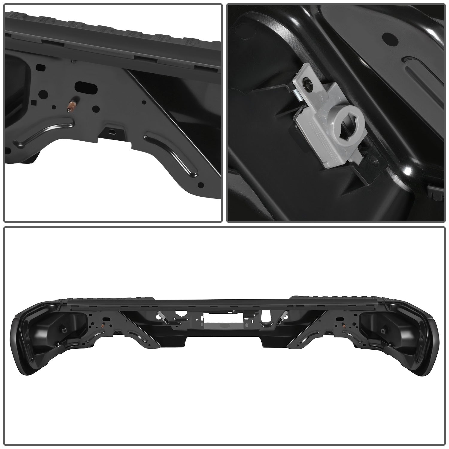 DEFENSA TRASERA 19-23 CHEVY SILVERADO 1500 GMC SIERRA 1500 ALSO FITS CHEVY SILVERADO 1500 LTD 22 AND GMC SIERRA 1500 LIMITED 22 - CORNER STEP MODEL W/ PARKING SENSOR HOLES - W/ EXHAUST CUTOUTS - BLACK/STEEL